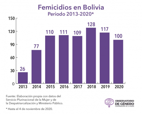 El 9 de marzo de 2013 entró en vigencia la Ley Integral para Garantizar a las Mujeres una Vida Libre de Violencia (Ley 348), la cual, en principio, representaba una esperanza para las mujeres de que los índices de violencia bajarían en el país. Sin embargo, en el último quinquenio se han mantenido por encima del centenar de casos. En 2015 (año de la plena vigencia de la ley) se registraron 110 feminicidios, en 2016 un total de 111 casos, en 2017 hubo 109 casos, en 2018 se registraron 128 casos, en 2019, 117 casos y en 2020, hasta el 4 de noviembre, ya se registra un centenar de feminicidios (ver tabla).