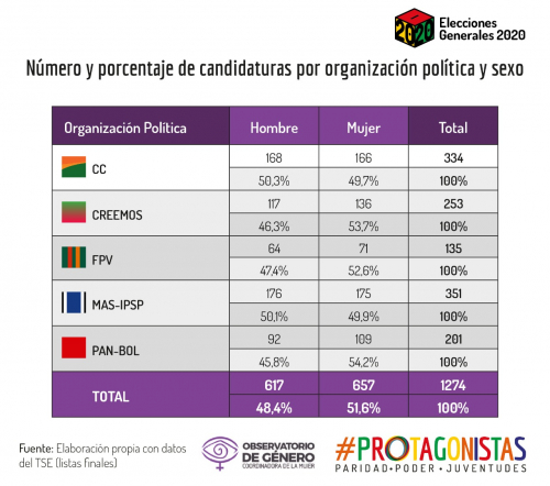 La Paz, 19 de octubre de 2020 (CM/II).- Las organizaciones de mujeres articuladas en torno a la campaña #Protagonistas: Paridad-Poder-Juventudes celebran el cumplimiento de la paridad en listas finales de candidaturas, sobre todo en titulares, pero advierten que hubo ciertas debilidades en las suplencias. Dan tres recomendaciones al Tribunal Supremo Electoral (TSE), con miras a los comicios subnacionales.