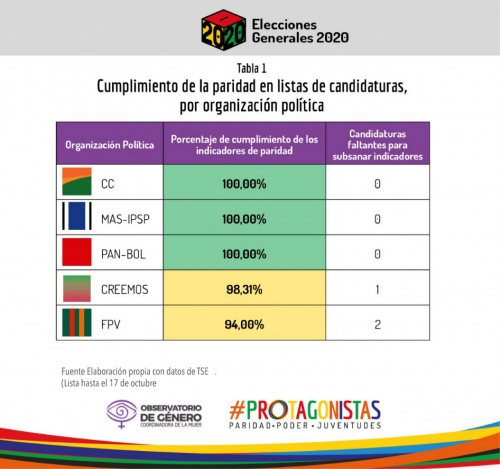 Mientras que Comunidad Ciudadana (CC), el Movimiento Al Socialismo-Instrumento Político para la Soberanía de los Pueblos (MAS-IPSP) y el Partido de Acción Nacional Boliviano (PAN-BOL) cumplieron con el 100% de los indicadores, CREEMOS y Frente Para la Victoria (FPV) quedaron cerca de la paridad plena con 98,31% y 94%, respectivamente. Al primero de ellos le faltó una candidatura femenina para representación supraestatal en puesto de suplencia, en Oruro; al segundo, una candidatura para senaduría en Oruro y otra en Beni, ambas titulares (tabla 1).