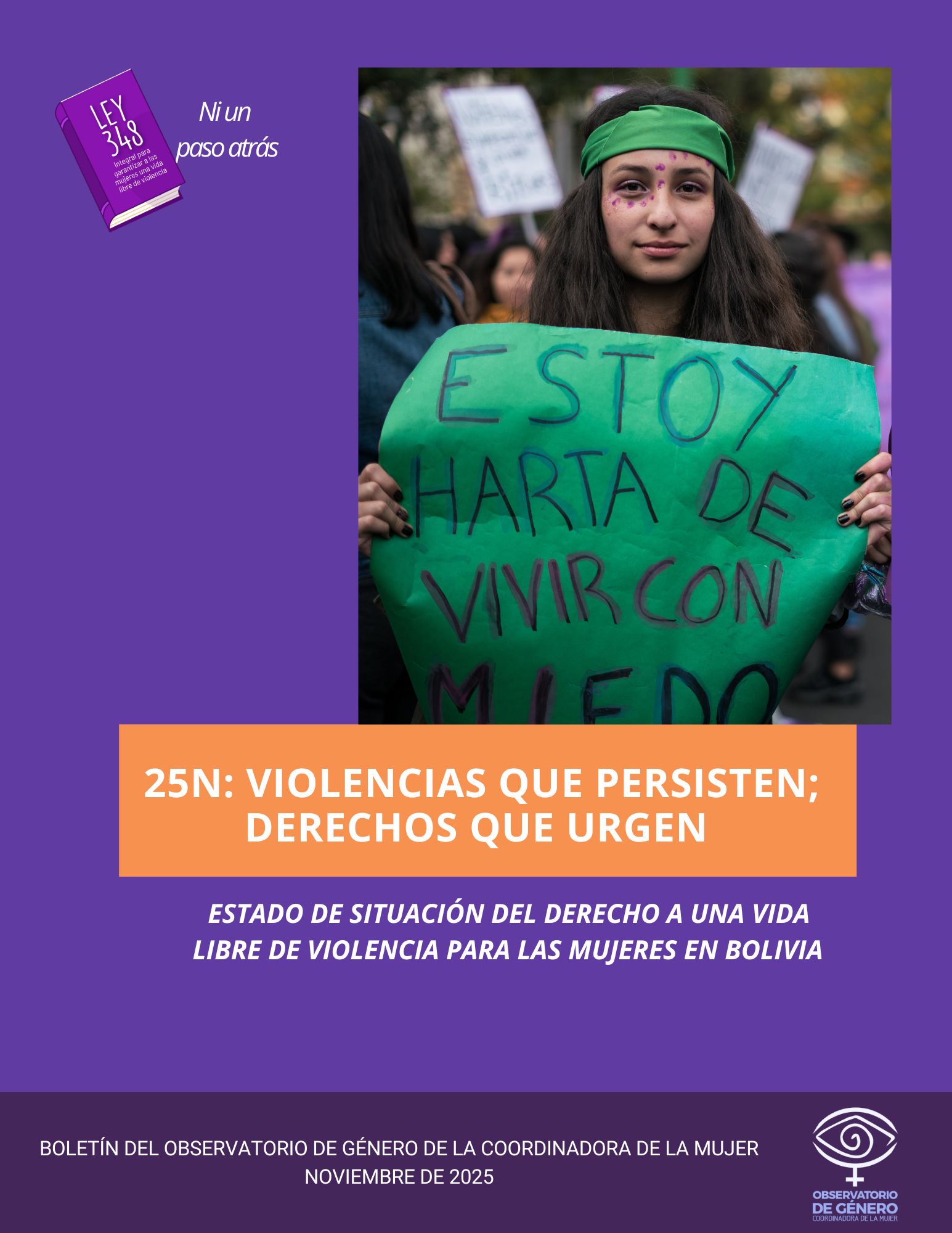 Este boletín presenta un panorama del estado de situación del derecho a una vida libre de violencia en Bolivia. Desde la Coordinadora de la Mujer, a través de su Observatorio de Género, en coordinación con la Comunidad de Derechos Humanos, la Alerta 348 y el Movimiento Juntas Hacemos Historia, ratificamos nuestro compromiso de seguir vigilantes, organizadas y firmes en la exigencia de justicia, reparación y transformación estructural.