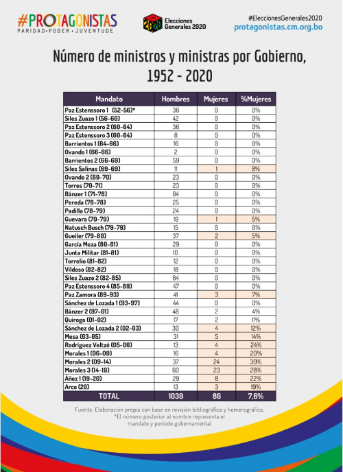 Desde la instauración del sufragio universal (1952) hasta hoy, cuando el Gobierno de Luis Arce conformó su nuevo gabinete, se realizó un total de 1.125 designaciones ministeriales, de las cuales 1.039 han recaído en hombres y 86 en mujeres. Esto quiere decir que en 68 años de historia política en Bolivia (democrática y no democrática), solamente 8% de las carteras ministeriales han sido ocupadas por mujeres, lo cual revela una profunda brecha de género en estos niveles de Gobierno.