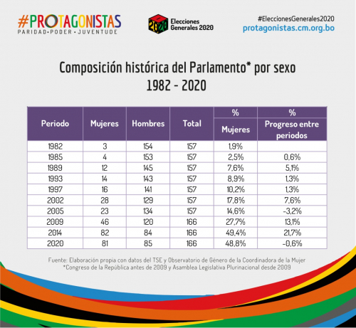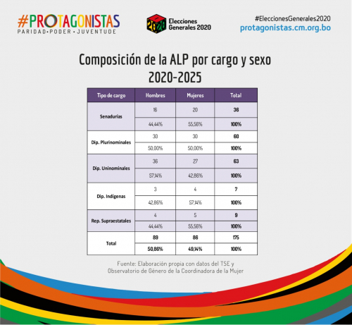 La Asamblea Legislativa Plurinacional abrió sus puertas a las y los nuevos asambleístas que fueron electos para el periodo constitucional 2020-2025. Por primera vez en la historia democrática del país, las mujeres son mayoría en la Cámara de Senadores y poco menos de la mitad en la Cámara de Diputados. En términos generales, la nueva ALP tiene una composición casi paritaria entre mujeres y hombres.