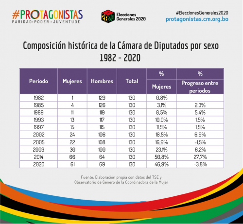 Históricamente, la Cámara Baja ha tenido un mejor desarrollo respecto a derechos políticos de las mujeres, ya que la presencia femenina se ha incrementado de manera paulatina, con un ligero retroceso en 2005, y ha logrado la paridad en 2014, efectivizando la normativa sobre paridad (ver tabla). En 2020, sin embargo, nuevamente hubo un retroceso que tiene que ver con un déficit de género en diputaciones uninominales (42%). Mientras, los otros cuatro tipos de cargo, senadurías, diputaciones plurinominales, diputaciones indígenas y representaciones supraestatales, tienen presencia equitativa o mayoritaria de mujeres.