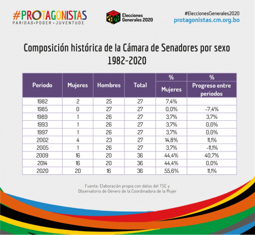 Según un análisis histórico realizado por la campaña #Protagonistas: Paridad-Poder-Juventudes, el reciente proceso electoral marca un hito para las mujeres en términos de participación política, pues la Cámara de Senadores había sido más resistente a traducir la normativa favorable a la paridad en realidad. Como se recordará, no fue hasta 1989 que se escogieron a las primeras mujeres senadoras de la era democrática (post 1982); en 1993 y 2005 se dieron retrocesos en cuanto a la presencia femenina, y hasta 2014 no se había logrado paridad en este espacio (ver tabla). En 2020, como se dijo, el Senado es de las mujeres.