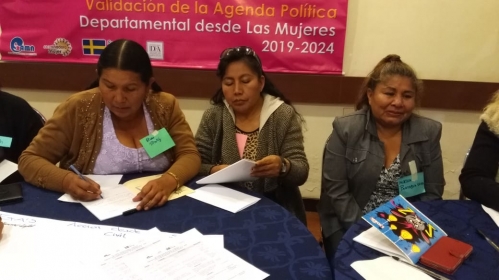 Representantes de al menos 50 organizaciones de mujeres participaron del Encuentro Departamental de Validación de la Agenda Política Departamental desde las Mujeres, que tuvo lugar en instalaciones del hotel Ambassador. La actividad fue organizada por el Centro de Apoyo a la Mujer y la Niñez (CAMN), afiliado a la Coordinadora de la Mujer, con el apoyo de la Embajada de Suecia e IDEA Internacional.