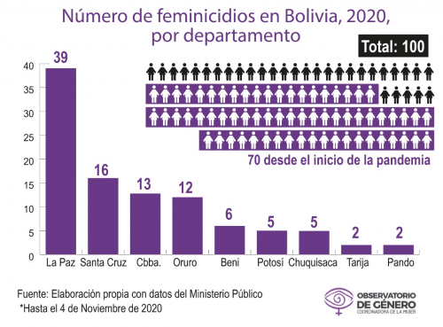 Cuando faltan pocos días para conmemorar el Día Internacional de la Eliminación de la Violencia contra la Mujer (25 de noviembre), Bolivia registra cien feminicidios en lo que va de 2020, siguiendo un dramático patrón el último quinquenio: más de 100 muertes de mujeres por año debido a la violencia machista. Organizaciones de mujeres demandan a las autoridades entrantes cumplir sus compromisos electorales para frenar este flagelo.