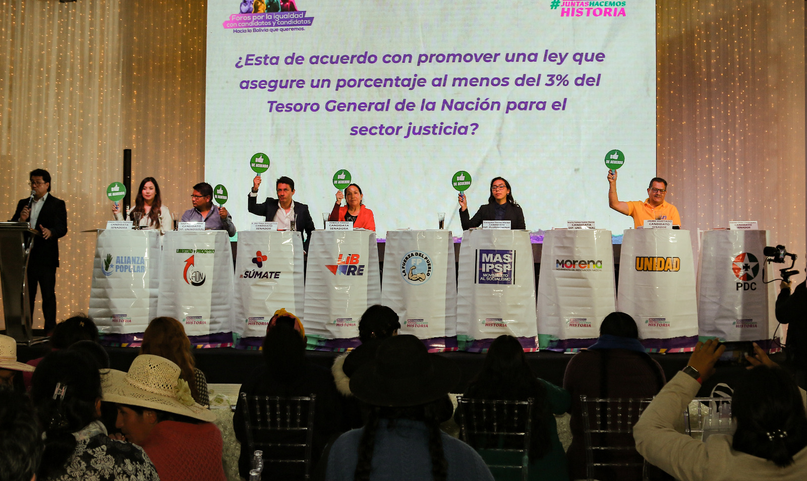 Durante más de dos horas de exposición, las y los candidatos enfatizaron en la necesidad de que la justicia boliviana está en crisis y que se requiere una reforma integral que garantice la transparencia y la independencia judicial. También se refirieron al acceso a la justicia de las mujeres en situación de violencia. Sin embargo, sus intervenciones carecieron de propuestas concretas, mecanismos legislativos o acciones políticas claras para garantizar dicho acceso.